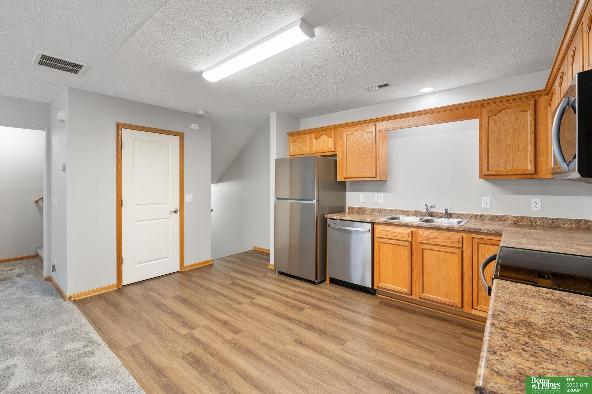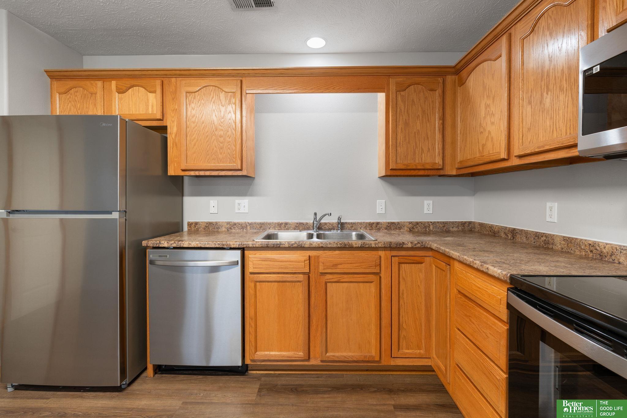 This townhome is move in ready and an easy transition from apartment living to home ownership. Your own 2 car garage, two bedrooms with vaulted ceilings, two bathrooms and an open living area make this a great space to live easily. You will have peace of mind with new SS kitchen appliances and a newer washer and dryer. New Air Conditioning installed August 2025. All new windows 2026. This sunny townhouse is conveniently located in the new heart of Omaha. HOA covers exterior maintenance so you just care for the interior! Easy living at it's best. Close to shopping, every convenience and an easy commute to anywhere in the city. This could also be a very nice property to add to your investment portfolio.